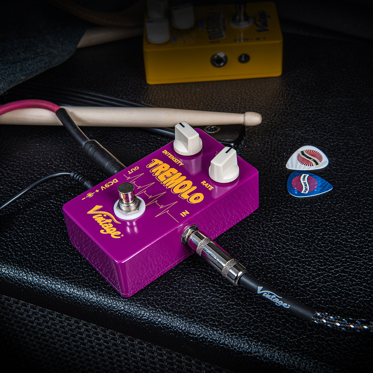 A vintage-style tremolo pedal that recreates classic tremolo tones (evoking retro amps and analog circuits). This is an easy to use Vintage style Tremolo Pedal with a wide range of Rate and Intensity. It's 2 controls give you all the access you need to dial up anything from a wildly insane Trem to a gentle and shallow wave, and all points in between.