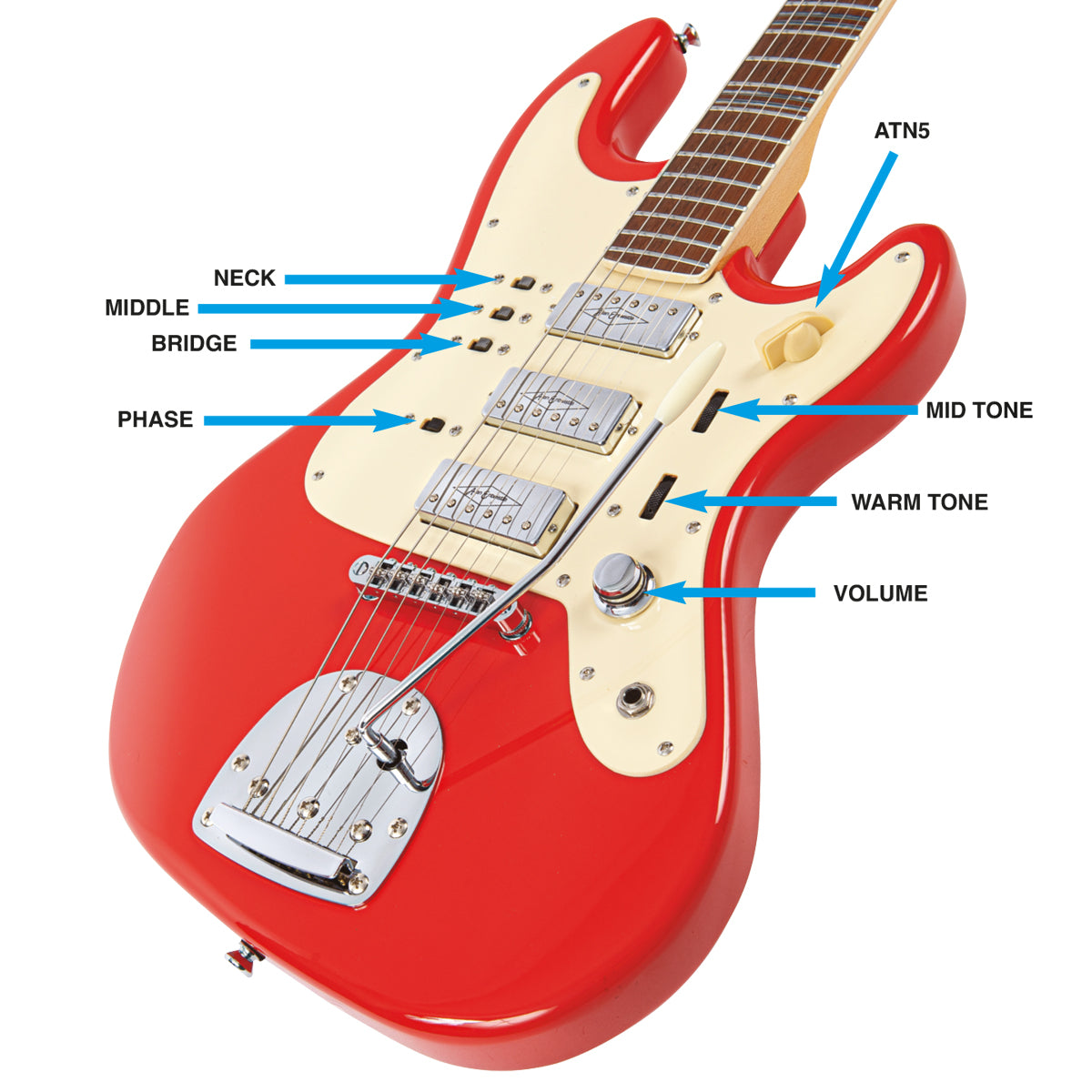 Controls: Volume, Tone 1, Tone 2 (note tone controls are roller controls), Slide switches - Neck, Middle & Bridge pick ups & Phase and ATN5